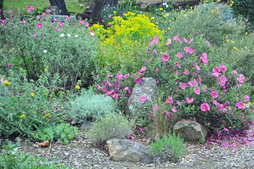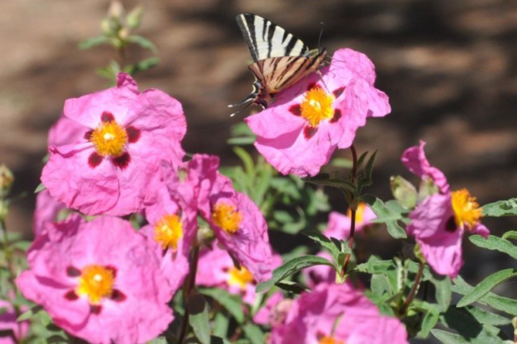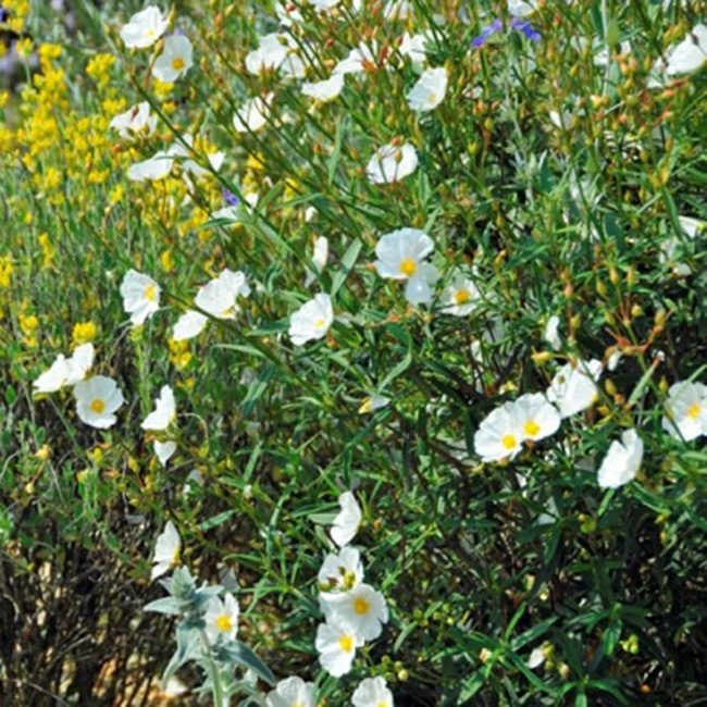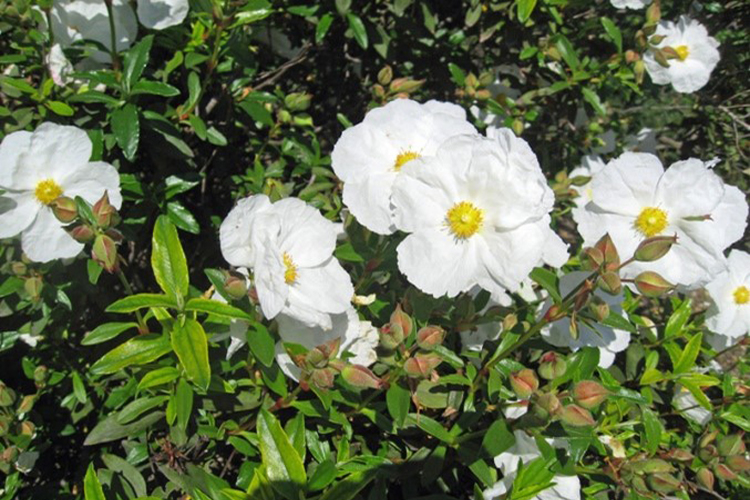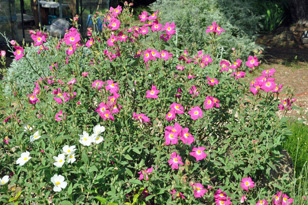 Cistus are essential for dry, unwatered gardens. They give colour and density to beds and rockeries and the beauty of the flowers and diversity of foliage, from grey to dark green, contribute to the magnificence of Mediterranean gardens. The scent of young shoots will perfume a sun-drenched garden.