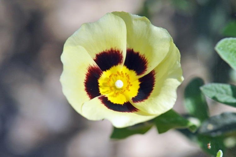 A cistus with flowers of a surprising colour – bright yellow with black spots. Its silvery-grey foliage becomes luminous in dry weather. Grows to H 0.80 x W 0.80 and blooms abundantly late in the season, in June, and sometimes until mid-July. Withstands alkaline soils.