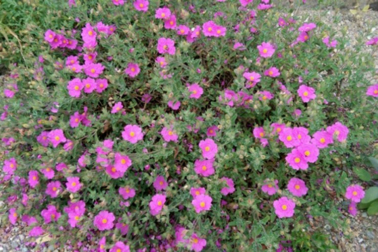 Shaped like a flattened ball, this cistus 40 cm high x 60 cm wide has bright pink flowers in May/June and can tolerates alkaline soils.