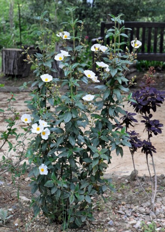 This cistus has an upright habit and can grow up to 1.2 m high and 80 cm wide. It has linear foliage and abundant small white flowers in April/May, preceded by red flower buds.