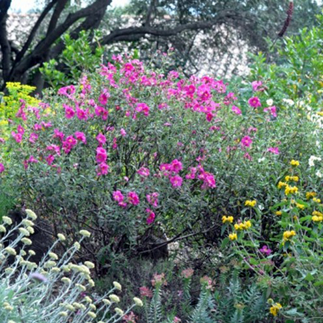 C’est le ciste de la garrigue. Ses feuilles duveteuses grises mettent en valeur ses fleurs rose clair. (1 m x 1 m). La floraison est précoce en avril. Supporte le calcaire.