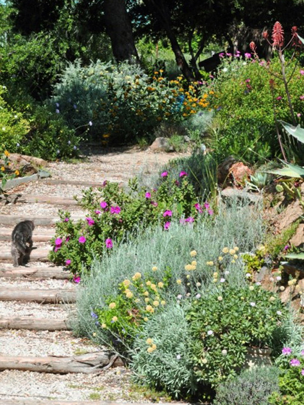 C. pulverulentus en bordure d’escalier. Il est intéressant car il a tendance à mordre sur les allées et casser leur régularité. Sur la photo, il est au niveau du chat. Il est accompagné (de haut en bas) du gris d’Helichrysum italicum, Helichrysum orientale et Lomelosia minoana.