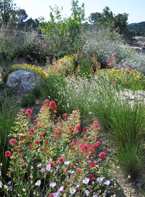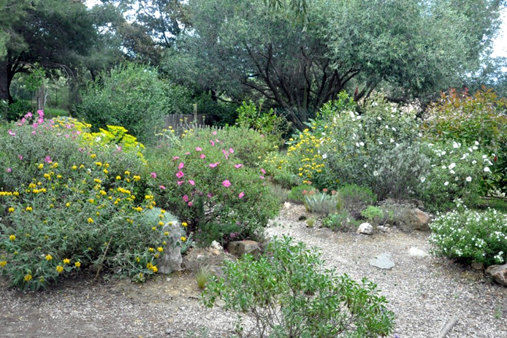 En s’inspirant des paysages de garrigue, on peut créer de grands massifs couvre-sol. Ici, ce ne sont plus les plantes individuelles qui agissent comme couvre-sol mais la masse des arbustes qui recouvre entièrement la terre.