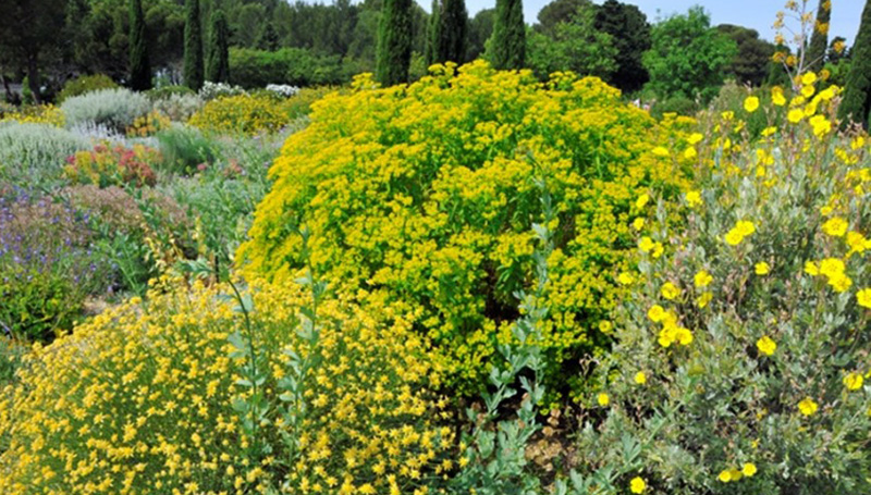 A symphony in yellow with Genista umbellata, Euphorbia ceratocarpa and Cistus x tardiflorens
