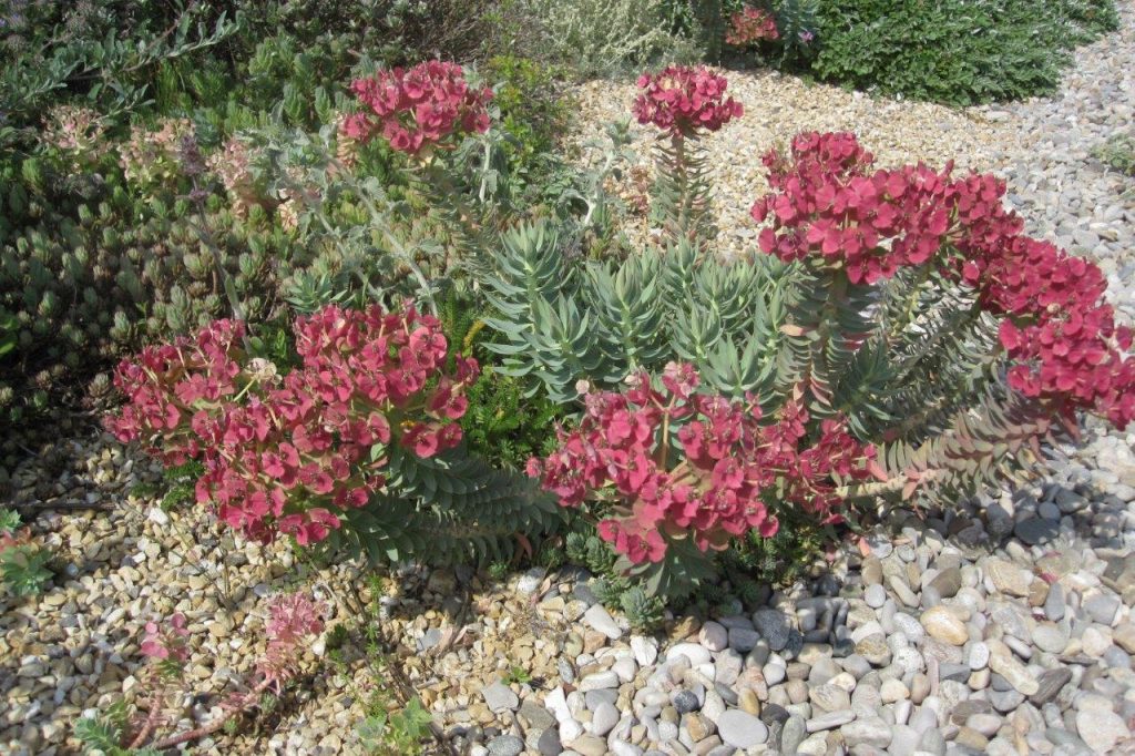 Euphorbia rigida avec un paillage de gravier petit et moyen