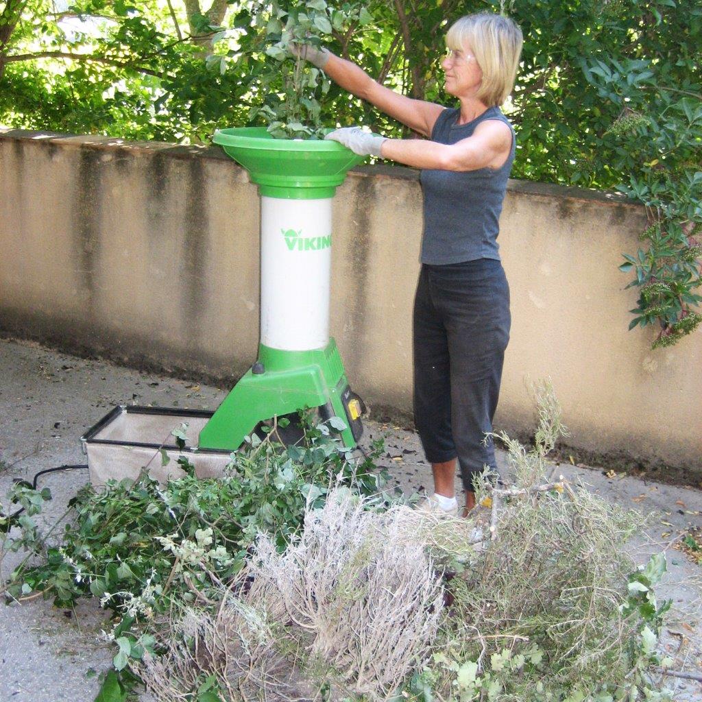 Avant d’ajouter au compost tous ces matériaux, la plupart doivent passer par le broyeur. Oui c’est un achat onéreux, mais cela vaut l’investissement. Les matériaux broyés font un compost magnifique en un rien de temps et différents matériaux peuvent servir à différentes choses dans le jardin, Par exemple comme mulch ou aussi en couverture d’allée de jardin. J’ai essayé plusieurs modèles de broyeur et finalement c’est le Viking GE 220 (remplacé par le GE 250) qui marche le mieux. Il accepte n’importe quoi, alors que d’autres marques comme le Eliet Neo, ne digèrent pas bien les matériaux verts et le mécanisme de broyage expulse beaucoup de poussière en pleine figure.