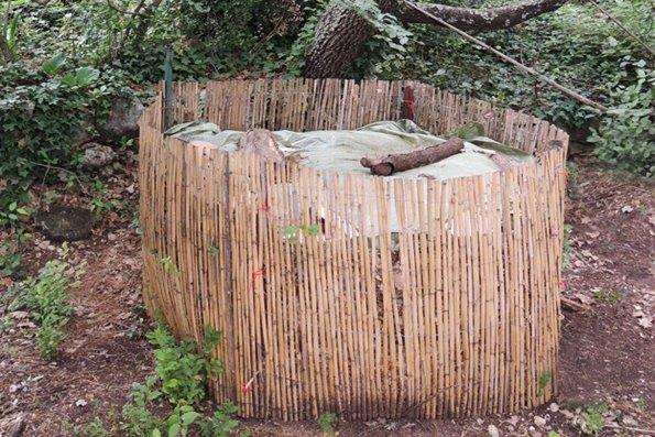 After adding layers of shredded material to the bin I mix them together with a garden fork then add a can of water, cover the pile with black plastic and leave it to cook. Decomposition is quicker if there is a good mix of greens and browns. Urine is useful as an accelerator.