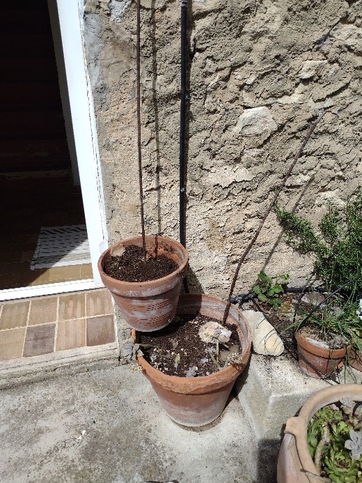 - Si vous souhaitez que les pots soient arrosés par votre arrosage automatique, préparez une longueur de tuyau principal (par exemple diamètre 16 mm) et quelques goutteurs (nous y reviendrons plus tard).