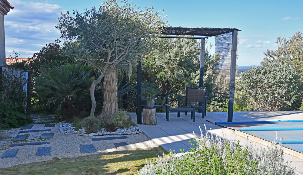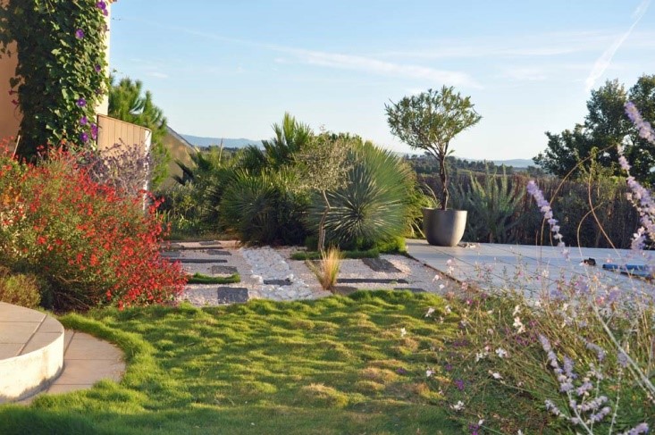 Nous avons créé deux petites buttes, une fleurie sur la droite (Nepeta fassenii ‘Dropmore’, Salvia gregii ‘Christine Yeo’ violette, Santolina lindavica, Helichrysum italicum, Gaura lindhemeiri, Perovskia ‘Blue Spire’ et Rhodanthemum hosmariense pour ses marguerites blanches de fin d’hiver) et sur la gauche une butte de petits palmiers et Yucca sur un tapis de Zoysia. Devant la terrasse de la maison nous avons créé une bordure fleurie. Un volubilis grimpe à l’assaut de la façade. La tonalité de l’ensemble est bleue et blanche (un peu de jaune et rouge).