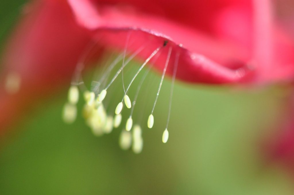 Bien entendu, les pucerons sont aussi arrivés suivis de peu par leurs prédateurs, dont les chrysopes (photo des œufs ci-dessous), les coccinelles et les syrphes. Nous n’avons pas eu d’attaque massive à déplorer et il a suffi d’attendre que ces pucerons disparaissent avec le temps.