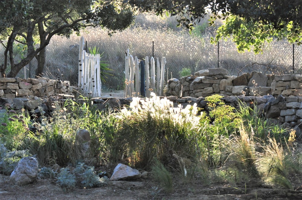 Another example is a flower bed that has evolved from ‘Piet Oudolf-like’ to ‘wild’. Initial attempts to create a bed with intertwining bands of blue and yellow flowers and a background of grasses failed miserably due to lack of water. Only the plants that thrived were kept, and mixed with native plants (wild radish, mustard, Glaucium corniculatum, helichrysum etc.). The plants were placed randomly, without a plan, to create a ‘wild bed’ reminiscent of a garrigue landscape, with sections of collapsed dry stone wall emerging here and there.