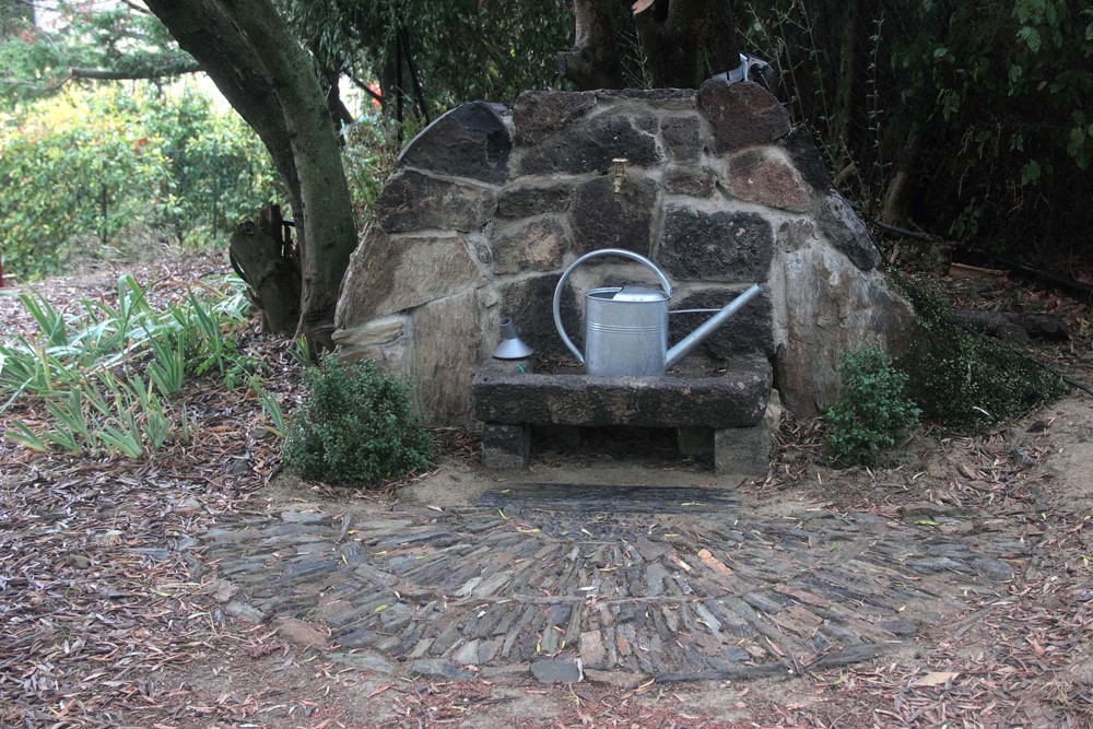 Comme déjà mentionné, nous attachons la première importance à la structure du jardin avec la conception de différents espaces «où l’on se sent bien» et aux tracés des chemins pour y accéder. Les plantes et les fleurs doivent servir le projet mais ne jamais s’y opposer. Globalement, la structure du jardin est faite. La dernière création est l’aménagement du point d’eau. La structure en pierres est bordée par une calade et des boules de Myrsine africana. Un Muehlenbeckia complexa commence à grimper sur un côté de la fontaine et un rosier liane, Rosa ‘Paul’s Himalayan Musk’ monte à l’assaut d’un olivier.