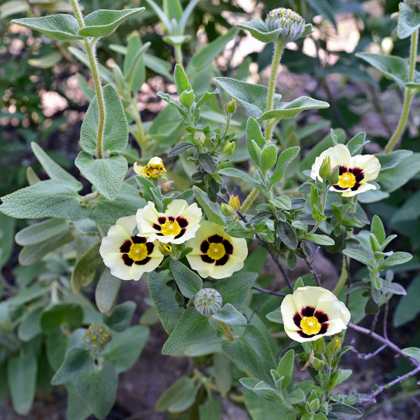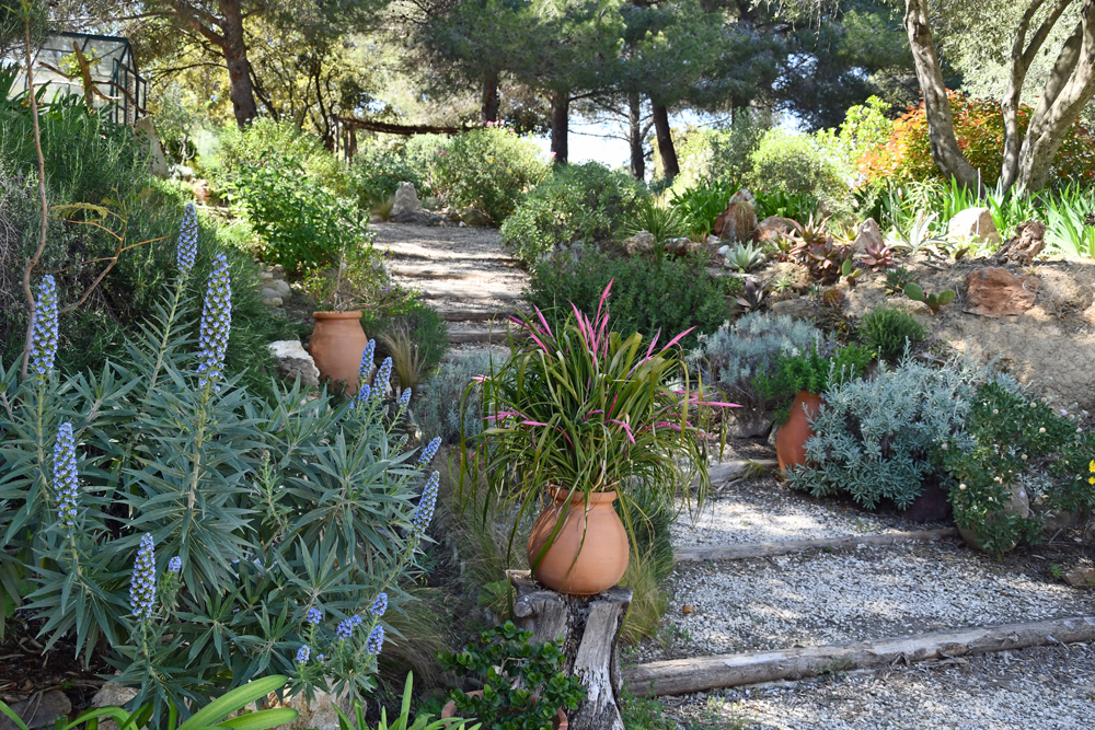 Comme dans de nombreux jardins méditerranéens, l’explosion des couleurs accompagne le printemps. Déjà en février, le jaune pâle des fleurs de Coronilla glauca «Citrina» contraste avec le bleu intense de la floraison de Rosmarinus officinalis «Sappho» alors que Rodanthemum hosmariense illumine les massifs de ses marguerites blanches. Les Ophrys pointent ensuite dans la partie sauvage du jardin. Puis les autres floraisons dont celles des cistes, santolines et sauges se succèdent en une fête continuelle. Mais je voudrais plutôt commenter un autre point.