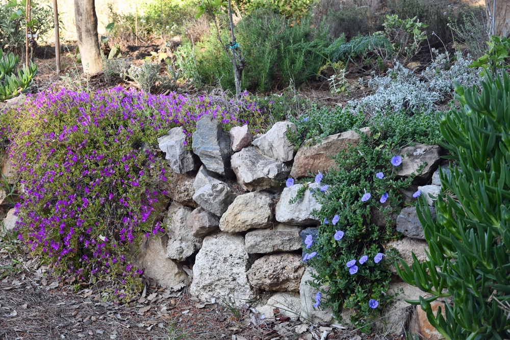 Installer des plantes ne nécessitant que peu d’entretien et d’arrosage, Le drainage a été amélioré avec des cailloux et du sable et beaucoup de plantes sont plantées sur des buttes. Ci-dessous, quelques exemples de plantes fleurissant actuellement.