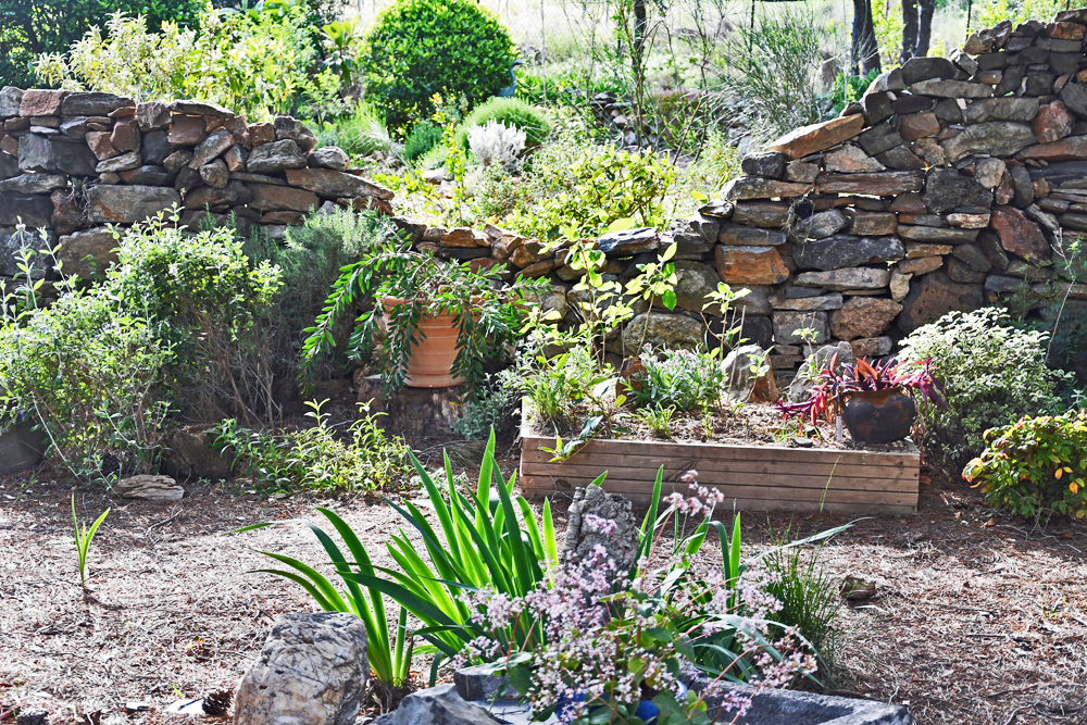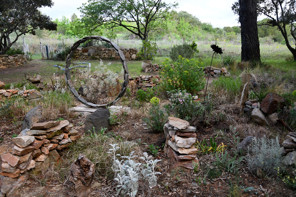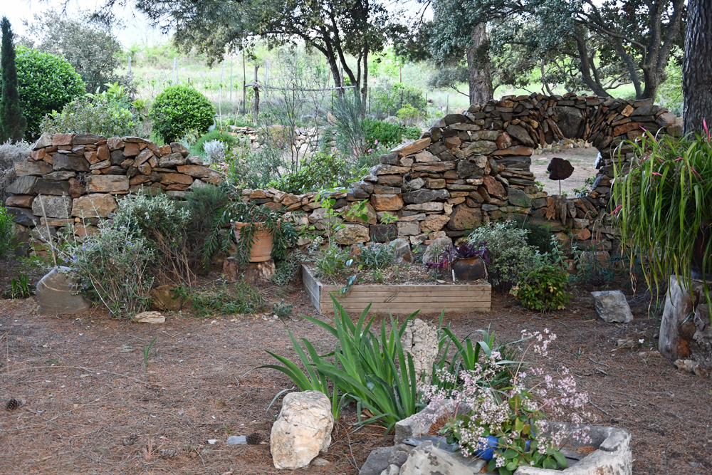 En 2013, du fait de la retraite les choses sérieuses peuvent commencer à l’automne. Le projet initial n’était pas de faire un jardin de collection de plantes. Nous avions plus envie d’un jardin structuré, en feuillage toute l’année, jouant avec les couleurs et trames de ces feuillages, où l’on se sente bien et en accord avec son environnement et bien sûr peu gourmand en eau et sans pesticides. Il fallait dessiner des allées sinueuses avec quelques points forts pour le regard, introduire des pierres, tant absentes, en créant notamment des murets de pierre sèche autant pour l’esthétique que pour la nécessité.