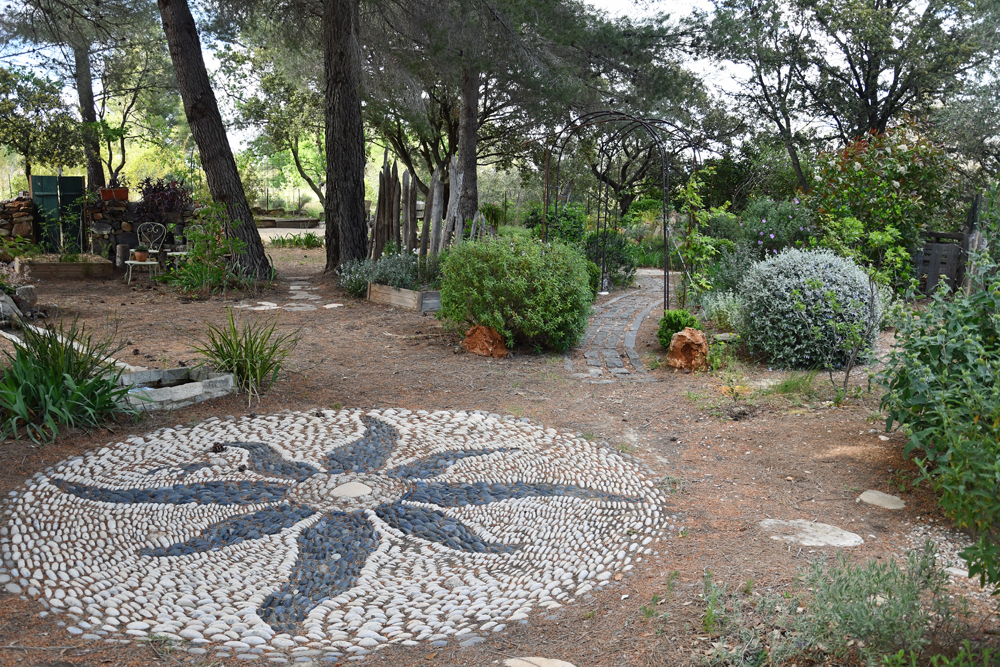 Espace de détente : après la butte, nous avons installé une calade, en forme de cercle avec un soleil en noir et blanc; là se situe à l’ombre des pins un espace de repas et de repos. C’est l’endroit le plus frais du jardin. Pour tenter de créer une ambiance plus intime, nous l’avons limité en arc de cercle par successivement un petit ouvrage en pierre (qui abrite une plancha), un massif de plantes formant des boules et juste sous les pins trois grands carrés en bois où les plantes sont surélevées. Le défi était de pouvoir faire pousser des plantes malgré la concurrence racinaire des pins, le tapis d’aiguilles et l’ombre à certains endroits. Les boules végétales, naturelles ou à mettre en forme, Teucrium fruticans ‘Ouarzazate’ (bleu) et ‘Gibraltar’ (blanc), Myrtus communis ‘Giulli’ et M. communis subsp. tarentina, Armeria canariensis, Buxus arborescens, Phillyrea angustifolia, Leucophyllum frutescens sont censées supporter la concurrence racinaire.