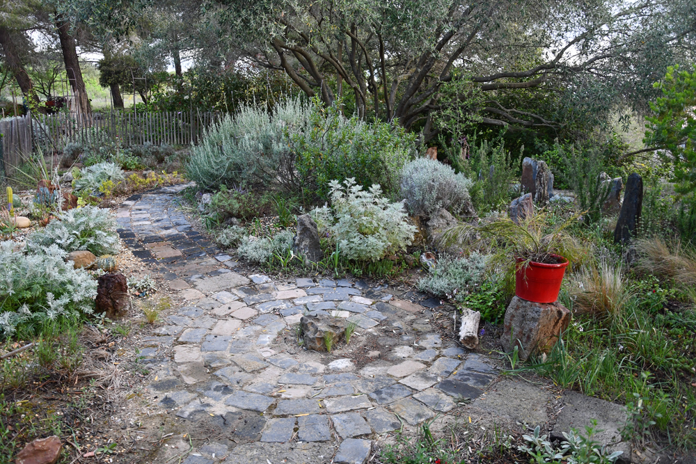 L’escalier et la butte : l’escalier en gravier a été créé en utilisant des troncs de cyprès de Leyland récupérés, passés à l’huile de lin. Les bordures ont été plantées de cistes, Helichrysum italicum, lavandes, Lomelosia cretica, Stipa tenuifolia. Des romarins rampants ont été installés sur un talus et des plantes grasses et cactées sur l’autre (Aloe striatula, Yucca baccata, opuntia, agaves). La petite butte en haut de l’escalier a été créée sur une partie difficile qui servait à parquer des véhicules et qui reçoit du soleil presque toute la journée. J’ai allégé le sol avec des graviers (insuffisamment je crois). Le choix des plantes de garrigue a été éclairé par la visite du jardin d’Olivier Filippi. Lavandes, cistes, santolines, phlomis etc… occupent le terrain. Les plantes ont 1 à 2 ans, 3 pour certaines, mais je n’ai pas encore réussi à les sevrer en eau d’arrosage (encore un arrosage par semaine durant cet été qui a été si sec). La butte est flanquée par deux chemins gravillonnés plus ou moins sinueux qui conduisent aux parties droite et gauche du fond du jardin.