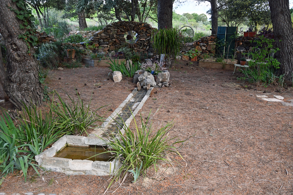 Pour cela un petit stage pratique dans le parc du Haut-Languedoc nous a permis d’apprendre quelques bases de technique en pierre sèche. Les pierres que nous nous sommes procurées proviennent presque toutes de récupération en déchetterie. On y trouve surtout des gravats mais sous les gravats dorment des trésors : pierre de taille, vieux carreaux, tomettes, tuiles canal patinées par le temps, lavabos et auges en pierre, objets magiques et nous avons même récupéré une collection de cactus et succulentes qui sont maintenant sur notre terrasse. Nous ne comptons plus les voyages en déchetterie ni les cubages de pierre.