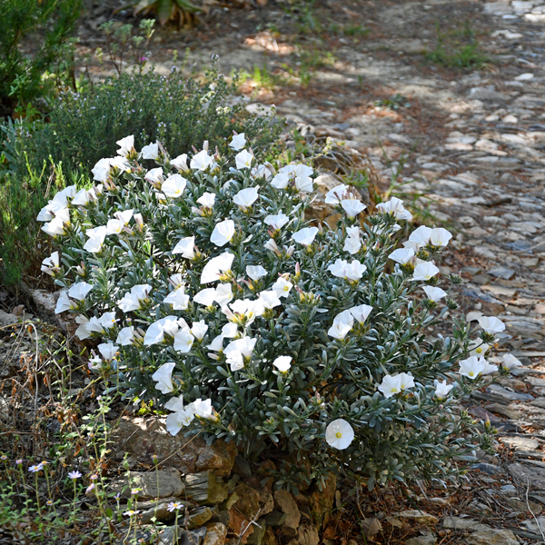 Choose plants which require little maintenance and watering. The drainage has been improved with pebbles and sand and many plants are planted on mounds. Below are a few examples of plants that are currently flowering.
