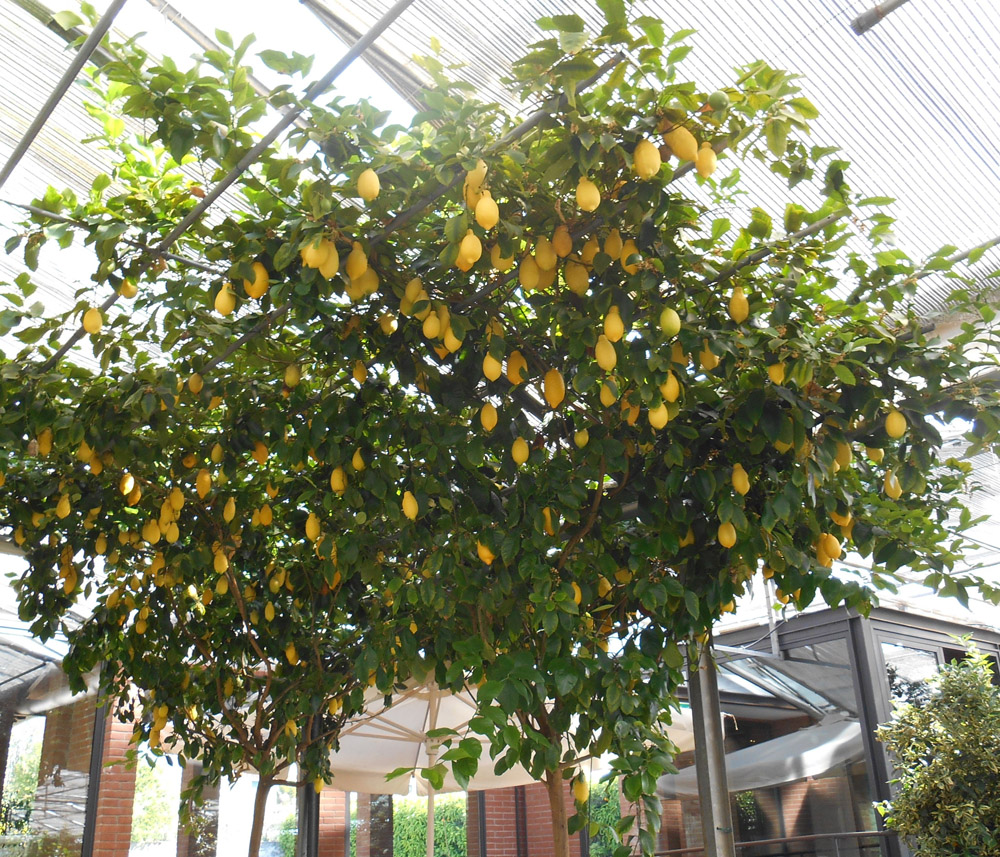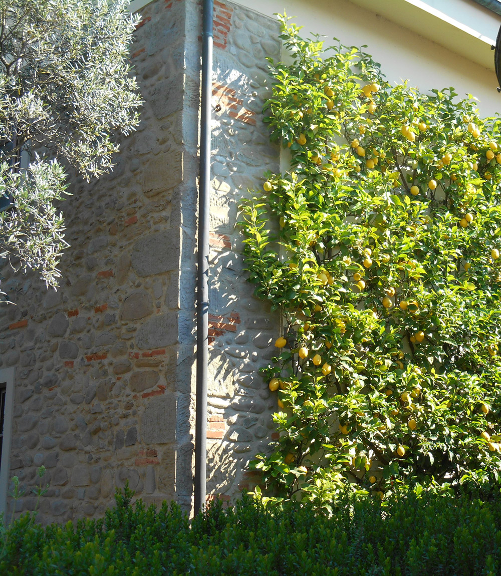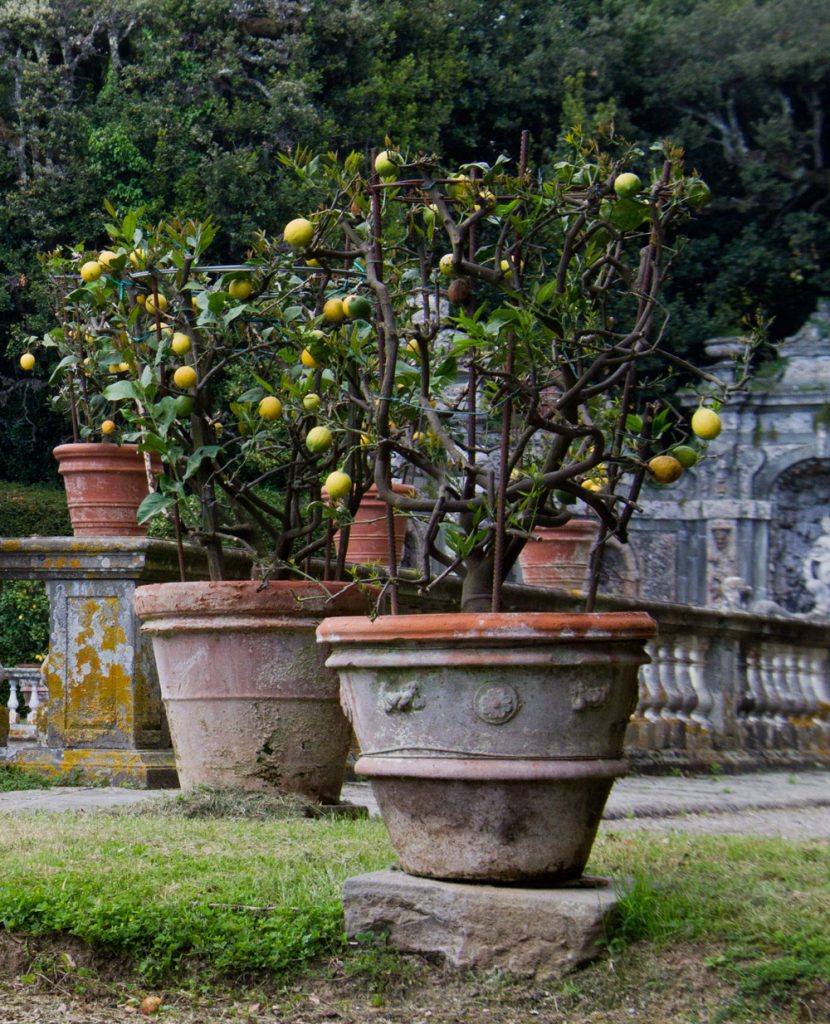 Presque tous les jardiniers italiens cultivent au moins un citronnier en pot, sinon des dizaines, qu’il faut bien sûr rentrer chaque hiver (ce qui implique un effort immense et parfois nécessite un chariot élévateur). Les citronniers sont remarquables pour leur beauté, leurs qualités décoratives (portant fleurs et fruits en même temps) et leur parfum délicieux et intense. Ils prennent toutes les tailles et toutes les formes : il y en a qui sont purement ornementaux, et d’autres qui donnent des fruits comestibles (et dont on peut bien sûr faire du limoncello). Mais il n’est pas obligatoire de cultiver un citronnier en pot. Pourquoi pas en espalier, palissé contre un mur abrité? Sur une arche ou un arceau ? Ou même pour couvrir une tonnelle, où les fruits pendants donneraient l’effet de décorations de Noël ? Pour ce dernier, pourtant, vous aurez besoin de supports très solides à cause du poids des fruits.