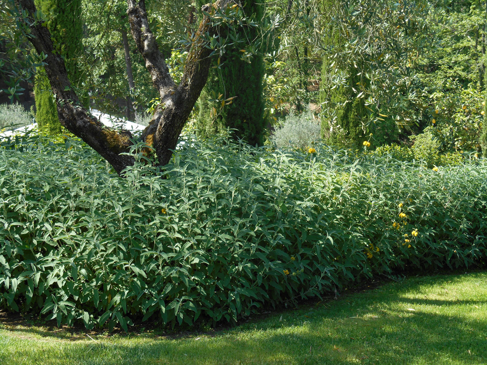 Vous voulez planter une haie et vous avez ras-le-bol du bon vieux buis, du Viburnum tinus et compagnie ? Alors pourquoi pas planter une haie de Teucrium fruticans ? Cet arbuste très versatile se prête à la taille, porte des feuilles argentées et des fleurs bleues et forme une haie belle et élégante à la fois. Une autre espèce que nous avons observée et qui forme une belle haie : Phlomis russeliana. Ces deux espèces sont toutes le deux très résistantes à la sécheresse. Vous pouvez les utiliser également à bon effet pour encercler le pied d’un olivier.