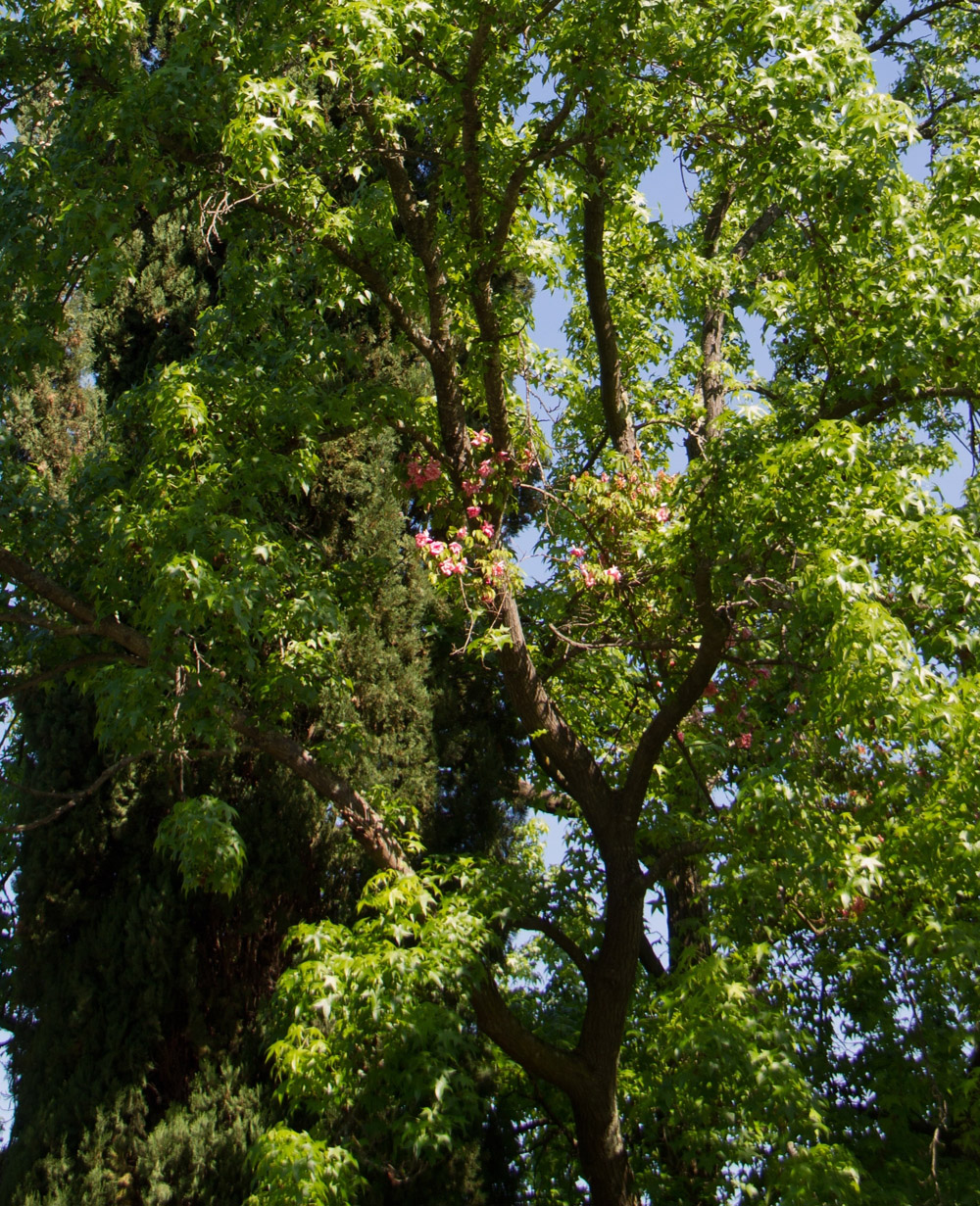 Olive trees are of course a feature of the Mediterranean landscape everywhere. But in one of the gardens we visited, the olives had been pruned in a very special way. The middle of each tree is pruned out and only a few widely-spaced long lateral branches left, which then are allowed to produce long sprays of silvery leaves. This gives the tree a delicate and transparent look, with the leaves glittering in the sun. Don’t expect fruit, though.