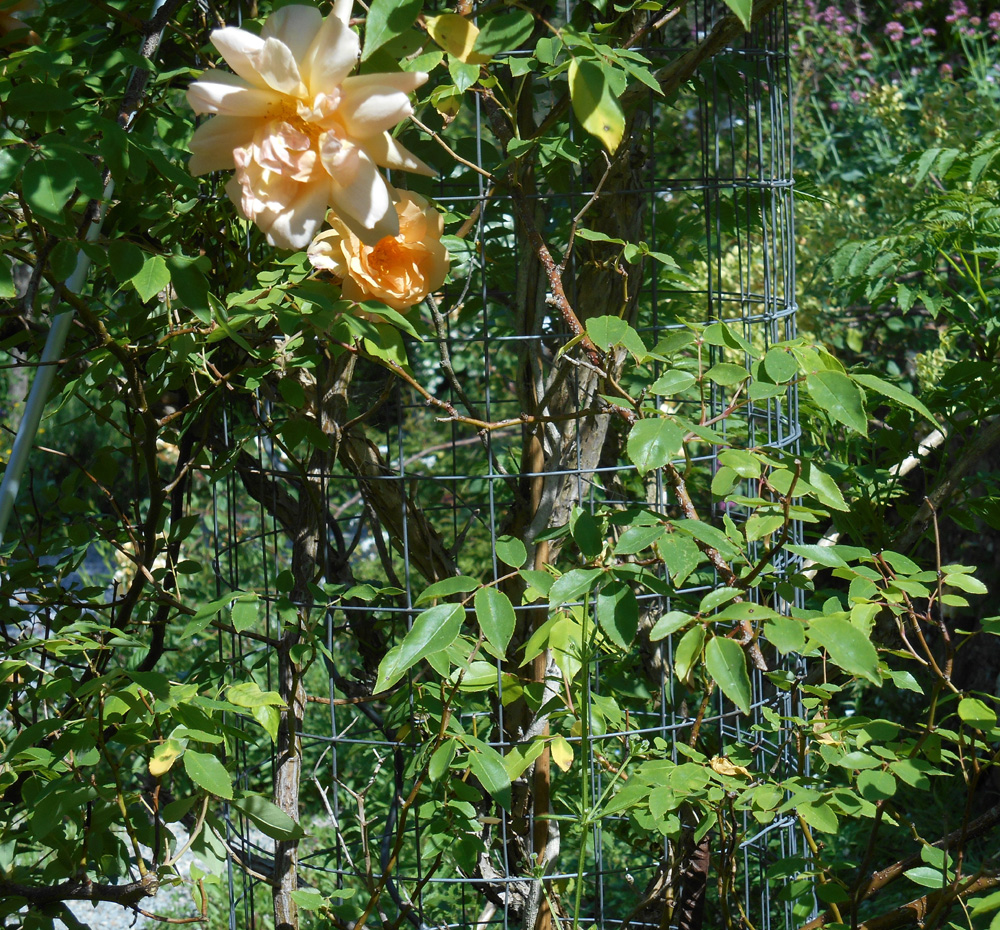 An eternal problem with rambling or climbing roses is how to support them. Here are a couple of good ideas from Tuscany. Firstly, grow your rose up an olive tree. Olives are particularly good for this because their shade is very light and because the silvery background will support roses of very intense colours. But any tree will do, even a very tall one. Secondly, try a cylinder of very wide-mesh wire netting. The rose-shoots will soon grow through and disguise the wire.