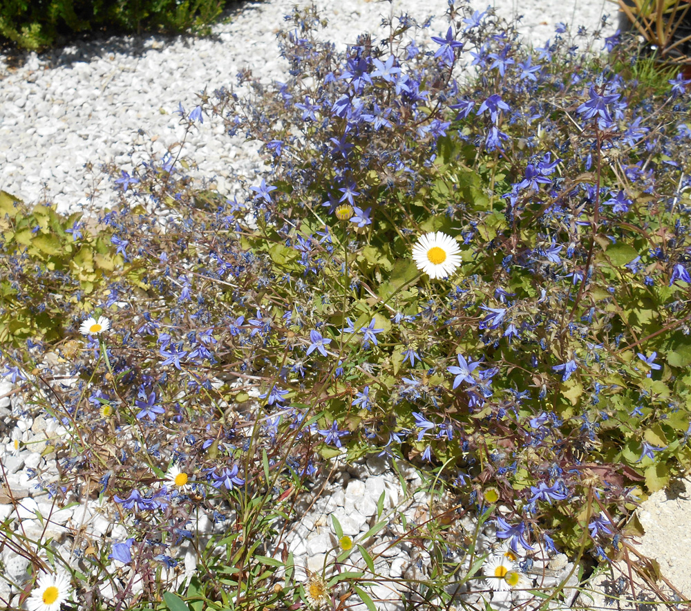 Erigeron karvinskianus est une petite plante modeste que nous avons vue pousser absolument partout dans les jardins que nous avons visités, même dans les endroits les plus inaccessibles. Cette espèce est cultivée comme plante tapissante, en pot, dans du gravier, dans les fissures de roche et de mur, en bordure de chemin, au bord d’une mare. Elle se ressème partout à son gré et fleurit pendant des mois avec peu ou pas d’eau. Je l’ai vue pousser en compagnie de Campanula poscharskyana, une autre valeur sûre dans le même genre.