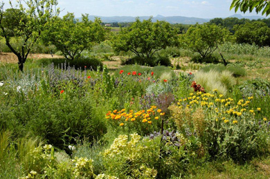 General Description: My ten year old garden is approximately 3000sq metres of old vineyard land in the Hérault valley near Gignac, about 3 miles from where I actually live. We inherited several varieties of fruit trees, and six rather decrepit vines. The Canal de Gignac runs beside the land, providing us with water from March to October and the garden has wonderful uninterrupted views across the vineyards and the valley. It is planted in an essentially wild, “prairie/garrigue” style.
