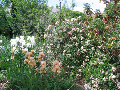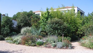 There are two Mediterranean beds in the middle bordered by a small bamboo grove. In this zone, some of the plants are watered once a week in summer and some not. These raised beds were created in 2006 and since then the plants have increased threefold. Our aim was first of all to hide the surrounding buildings with trees and bamboos then to cover the walls surrounding the garden with greenery. This was an opportunity to plant lots of different climbers.