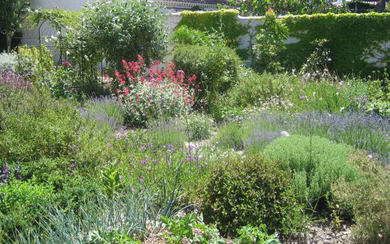 Soil and climate: Work on the current garden commenced in 2007. The only vegetation was three olive trees, a vine, four cypress trees, a bay and a neflier. The soil is generally workable with a roughly neutral pH – no doubt a result of the garden’s former history. Carpentras is on official record as having the greatest extremes of temperature in France recording -10ºC in March and 43ºC in summer. Despite being sheltered by stone walls, the garden also suffers the impact of the mistral blowing down the Rhône corridor. There is no well or forage (although a right to flood the property from a nearby lake exists!) so rain water is collected and stored and supplemented by automatic watering from the town supply for newly planted areas and the potager.