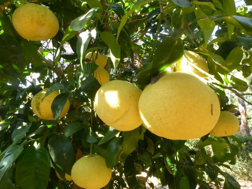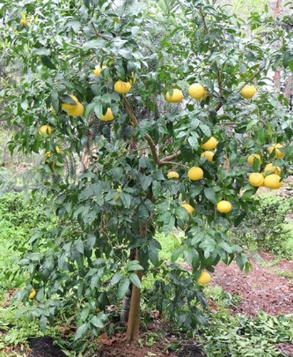 Ensuite, pour me faire une idée plus précise en condition de jardin, j’ai testé sur un pomelo ‘Oro Blanco’ l’épandage de ces “déchets à forte dose (4 brouettes de feuilles d’eucalyptus recouvertes de 4 autres brouettes d’aiguilles de pin) chaque année en fin d’été et début d’automne, lorsque ces aiguilles et feuilles m’encombrent. J’y ajoute deux compléments. Comme mon sol est spontanément acide, je saupoudre ces feuilles d’un demi-seau de 10 litres de cendres de bois, dès que ma cheminée fonctionne (2° quinzaine de novembre), puis comme un agrume est gourmand et que cela active la décomposition de la matière organique, j’épands dès que les bourgeons du pomelo gonflent (2° quinzaine de février) 5 à 6 poignées 5 d’engrais complet à l’aplomb du feuillage et récidive à la mi-avril au moment de la nouaison et début de grossissement des fruits.