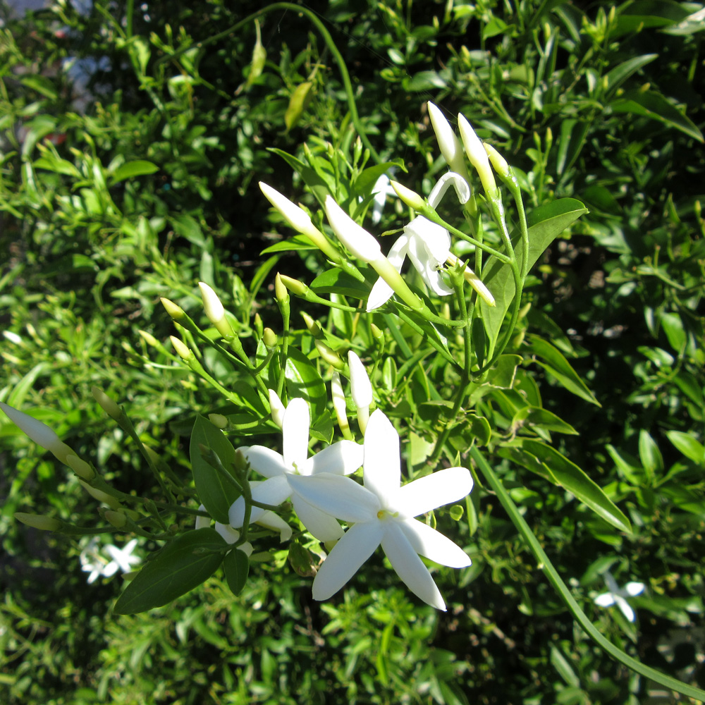 Jasmines need sun, good, well-drained soil and an annual dose of fertilizer. They should be watered for the first two years but once established they should manage without watering. Propagation is best done by cuttings, rather than from seeds.
