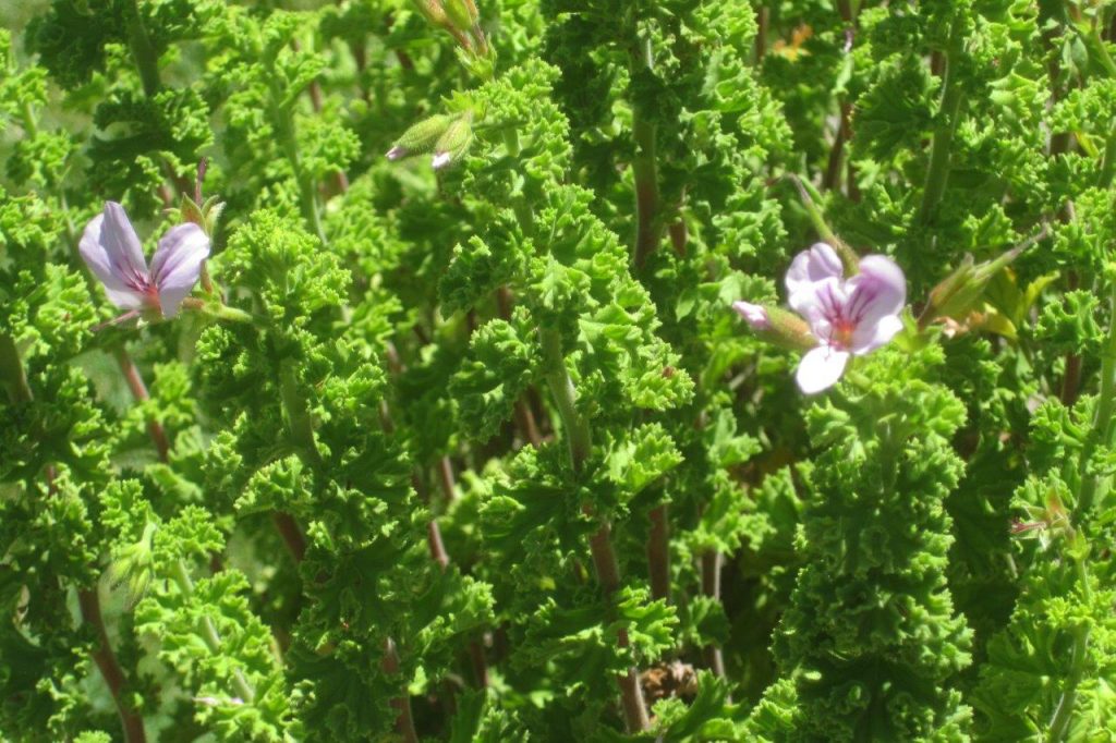 We were greeted at the entrance to the garden first by extremely garrulous parrots, then by pots of scented-leaved pelargoniums leading to a whole section of the garden devoted just to these wonderful plants. We were much taken with the lemon-scented Pelargonium crispum and by Pelargonium ‘Prince of Orange’ with its scent of orange peel.