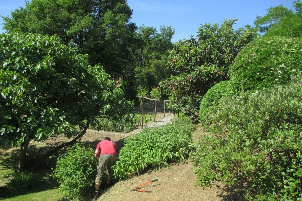 Driftwood from the river and fallen trees became garden benches. The gardeners worked quietly, methodically, trimming the shrubs with hand shears.