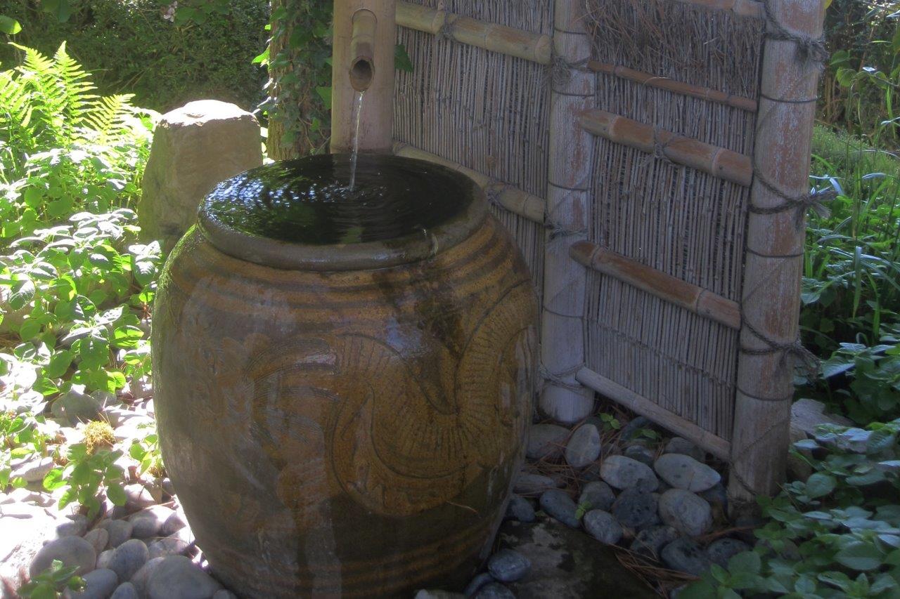 One first arrives at the ‘jardin d’accueil’ where a terracotta pot and a bamboo water feature represent the traditional Japanese symbol of purification.