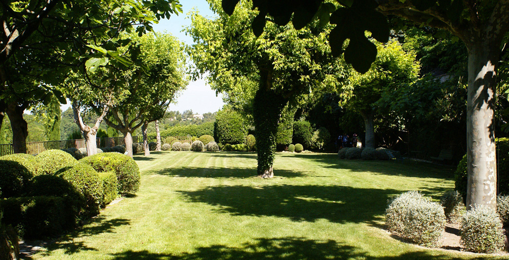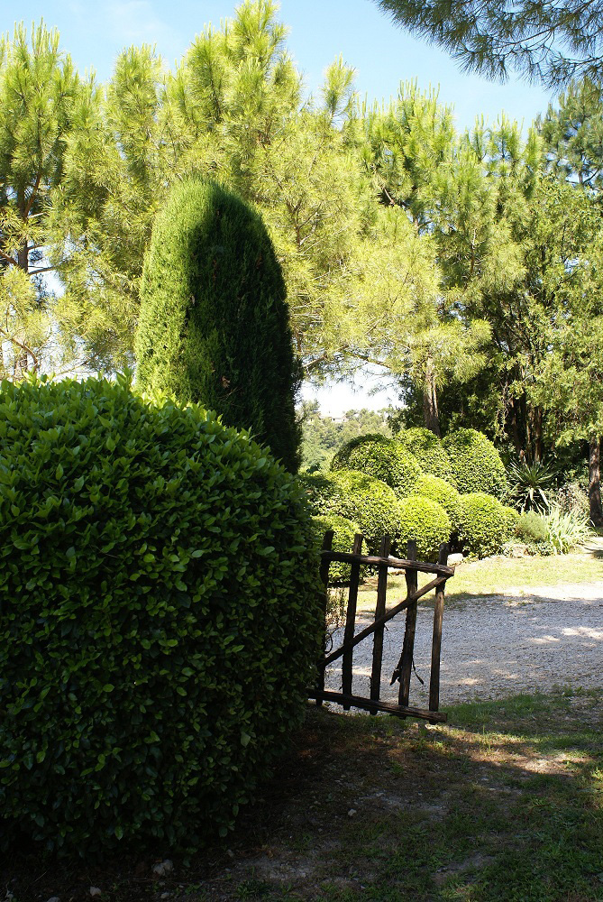 The garden was created some twenty years ago by the owner and designer of the better known La Louve garden, Nicole de Vésian. Every garden is different, but in its combination of style and terrain Le Clos Pascal has a particular quality which stays in the memory. It divides itself into two very distinct parts although throughout there is the unifying style of topiary at which the French excel. The first is the ‘jardin’, a large rectangular lawn edged with clipped box shapes and dotted with mature trees, one a plane tree surrounded by boules of Teucrium fructicans.