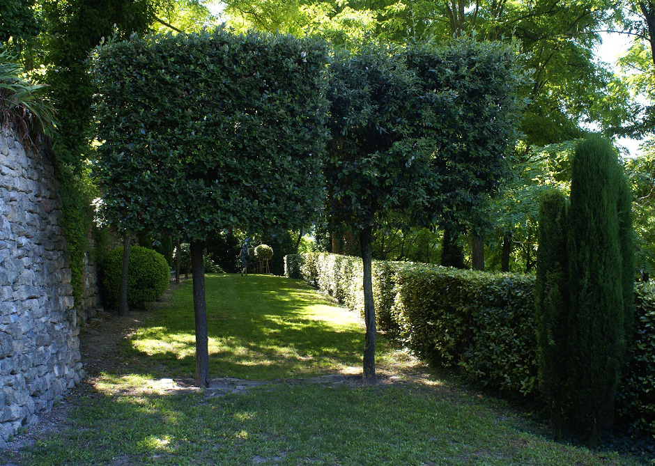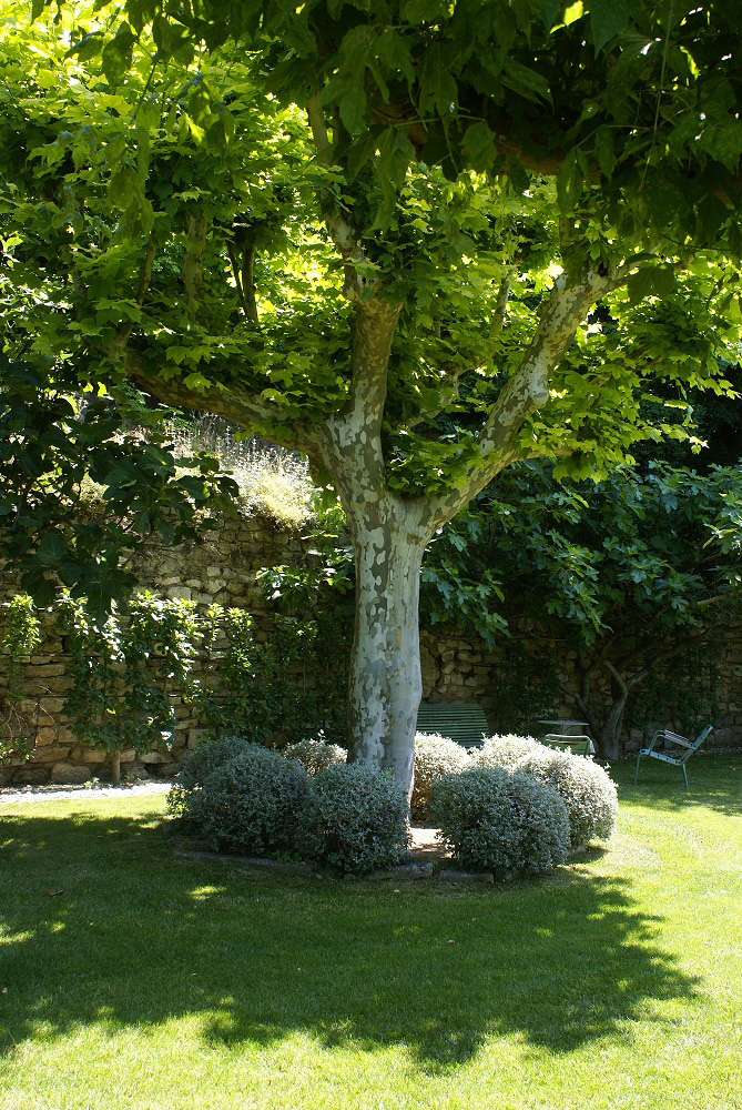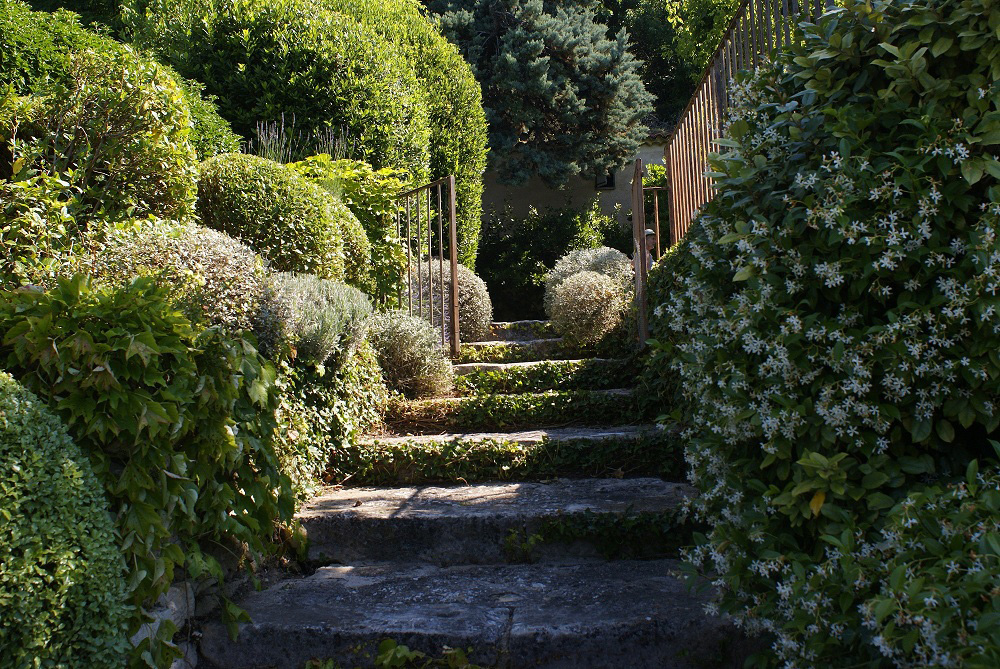 To the side and below there is a pool edged with attractively weathered stone. From the ‘jardin’ a shady walkway, lined with pines and clipped tilleuls (and at ground level more shaped box and teucrium) takes you to the ‘parc’.
