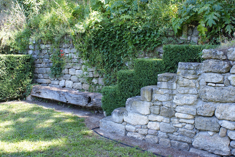 Flat this is not. The steeply sloping site faces south-west with views of the Montagne du Luberon. The soil is shallow, alkaline and stony. Many years previously terraces had been created for farming purposes but had long since fallen into disrepair. Nicole de Vésian specified the reworking of the terraces using reclaimed local stone. The gardener, Stephan, has been there since the garden’s inception and testifies to the extent of the work involved and the attention to detail.