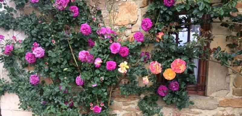 Climbing roses on the abbey wall / Rosiers grimpants sur le mur de l’abbaye