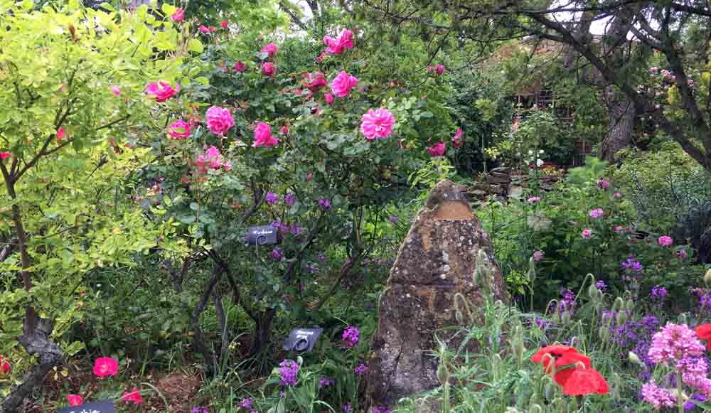 We were welcomed by one of the gardeners, Nance, who led us through the ‘voie des roses’, established 15 years ago, and which contains hundreds of varieties of roses. The garden is cultivated in a natural way, using local lavender and straw for mulching, and encouraging a range of garden insects. To create diversification and balance in the garden, wild flowers are allowed to grow amongst the rose beds. Moreover, wild species from around the world and also a selection of seedlings from natural crosses have allowed the modern roses to evolve.