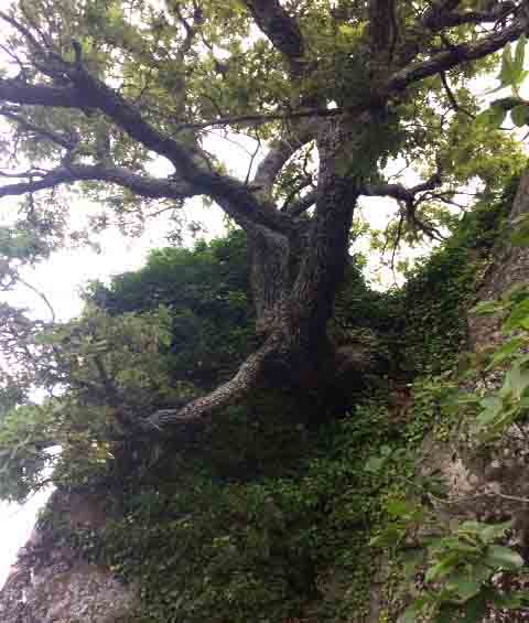 Nance pointed out an unusually shaped 300 year old oak tree (Quercus pubescens) that protrudes out of a rock. Its origin coincides with the departure of the monks at the time of the French Revolution. Quercus pubescens is a marcescent tree, meaning that the leaves are retained on the tree all winter, only dropping in spring to leave space for the buds growing into new shoots. In 2001 this tree received the label ‘arbre remarquable’ by the Ministry of Culture.
