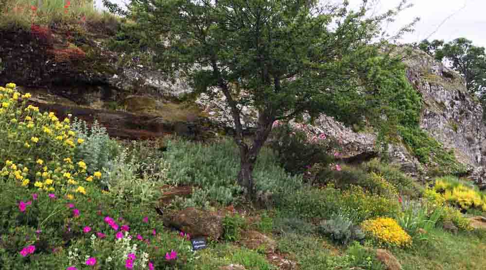 Nance nous fit remarquer un vieux chêne de 300 ans au port singulier qui sort d’un rocher. Son origine coïncide avec le départ des moines lors de la Révolution française. Quercus pubescens est un arbre marcescent, dont les feuilles fanées restent sur l’arbre tout l’hiver et tombent au printemps pour laisser place aux bourgeons des nouvelles pousses. En 2021, cet arbre reçut le label « arbre remarquable » par le Ministère de la Culture.