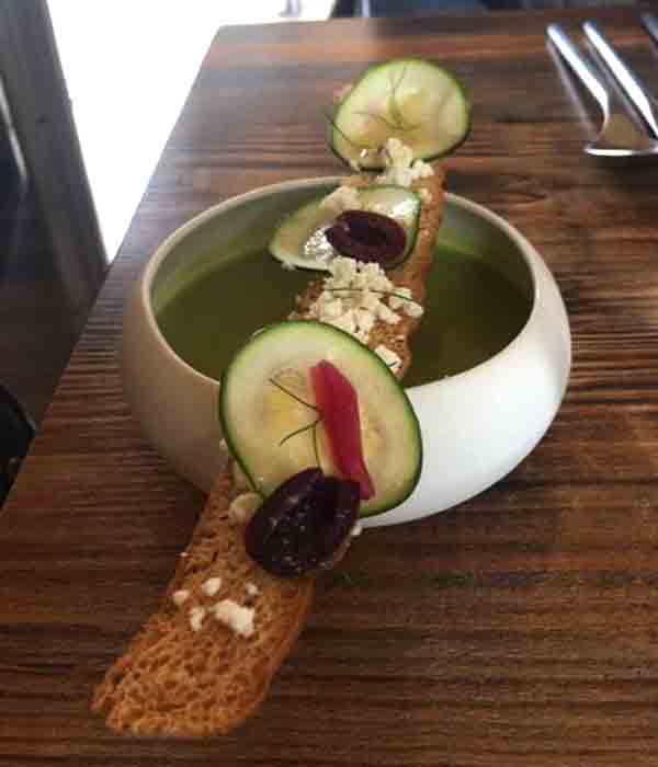 Velouté glacé de courgettes, chèvre frais, olives kalamata, foccacia