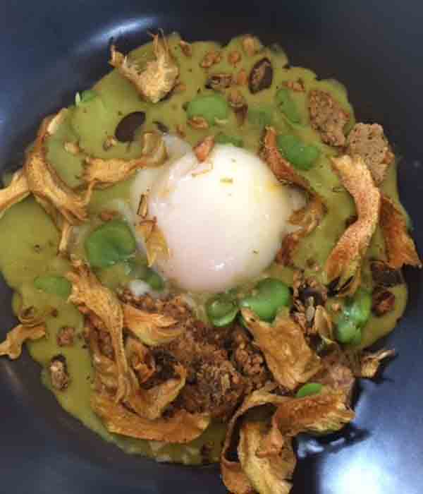 Oeuf parfait bio, purée de petits pois, févettes du jardin et artichauts
