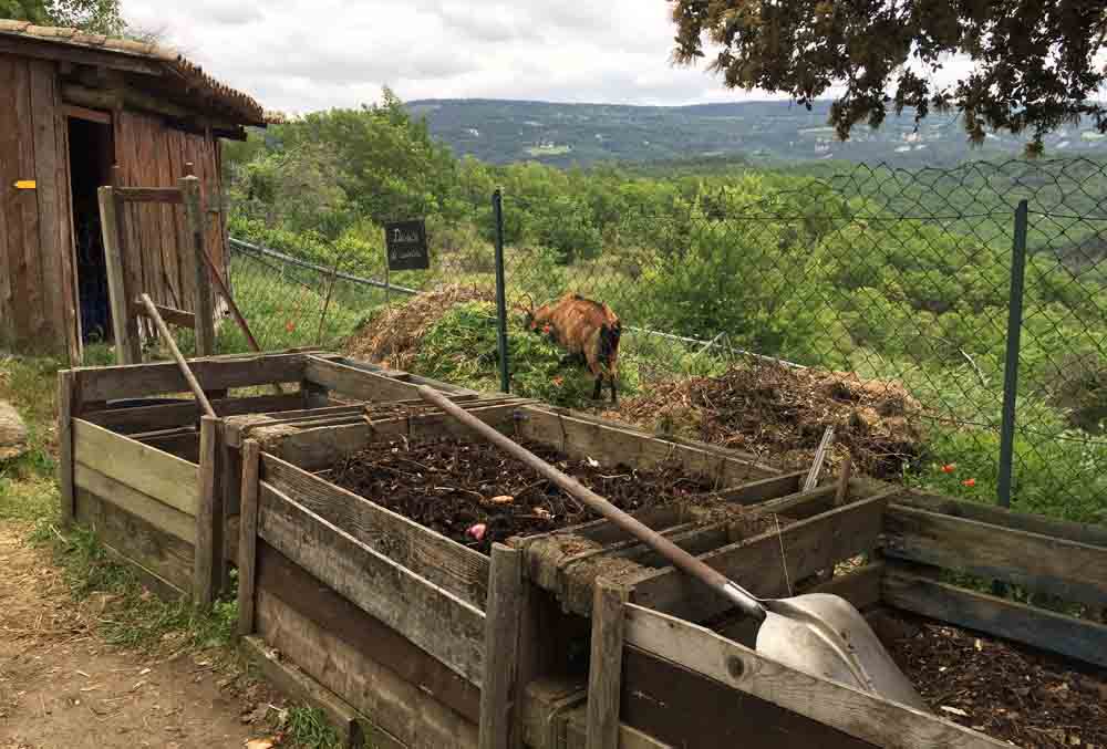 A goat forages in the compost area / Une chèvre grignote dans le compost