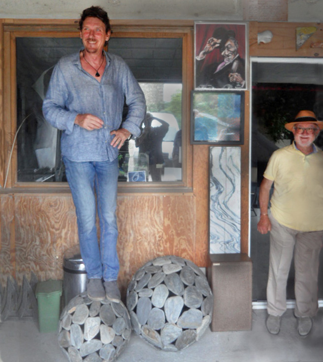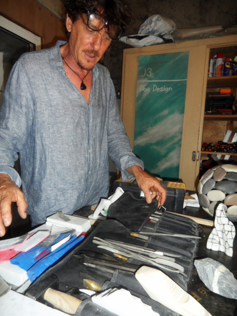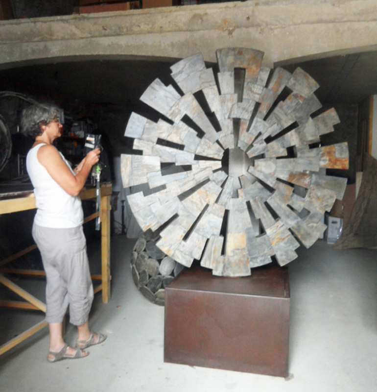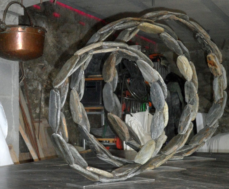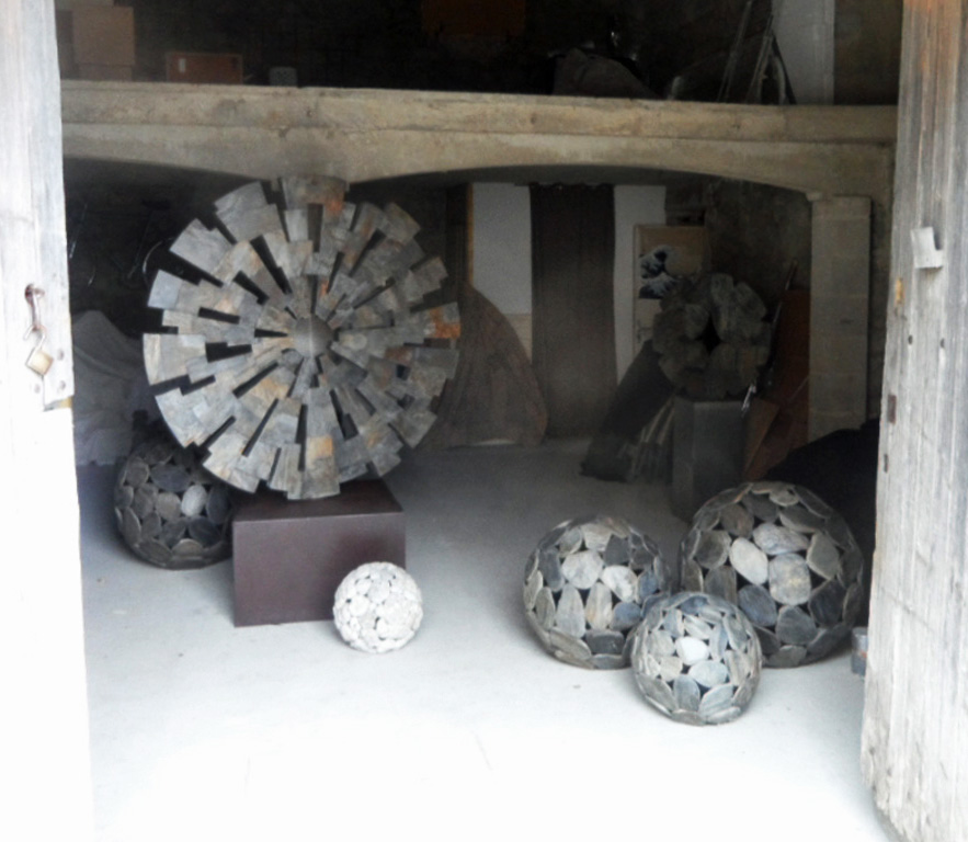 In the morning we paid a visit to the workshop of sculptor Denis Augé, in Fabrezan (Aude). He is one of a rare group of sculptors that work with stone/pebbles. His pieces are designed to decorate gardens. As a result of his training in electro-mechanical engineering and robotics, he has invented and patented glue that allows him to stick stones together, and in particular, the schist derived from the Montagne Noire. He creates extremely solid structures such as spheres and circles, including structures of different sizes where the stones take on an airy appearance, playing games with light.