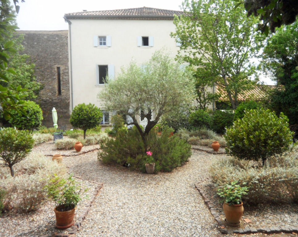 Un salon et une pergola occupent un autre niveau supérieur. Tout autour sont plantées de nombreuses espèces dont des graminées. De là une belle perspective se dégage sur la garrigue proche.