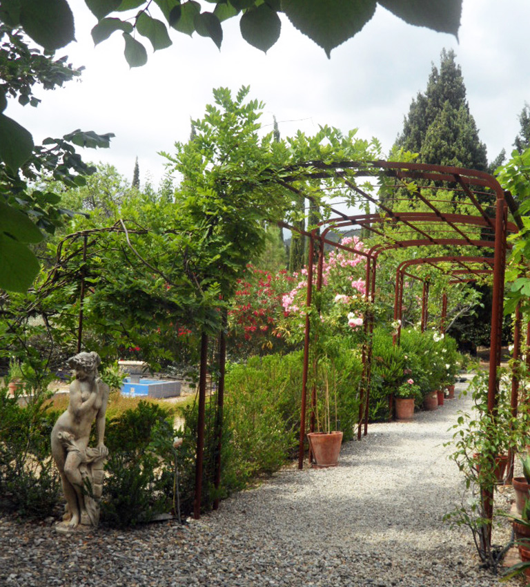 Liz and Jacques showed us their garden. This 2500m² space is was developed by Liz as several ‘rooms’ on five different levels. This layout works very well and creates an ambiance of softness and harmony, probably due to the inspiration of Moorish design in several of the ‘rooms’. On arrival one is immediately captivated by the first space, situated at the rear of their residence, with its layout in the shape of a cross and square parterres bordered by Teucrium fruticans, echoing the facade. A long pergola clothed in Rosa ‘Pierre de Ronsard’ provides a perspective towards the upper level.