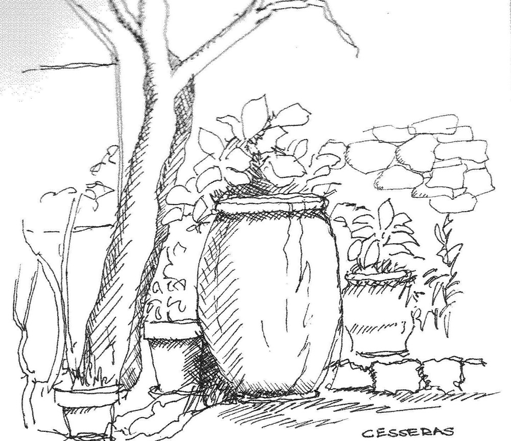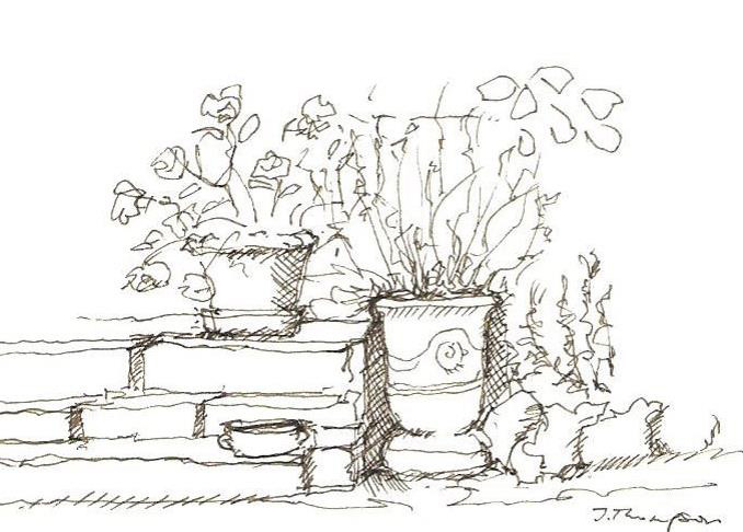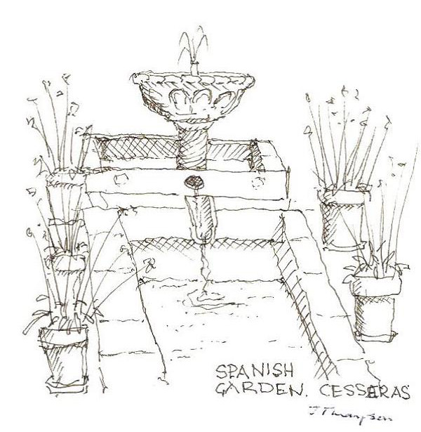 On the left of the pergola, a Moorish style garden room with a narrow, rectangular pond decorated with beautiful, Spanish, multicoloured tiles. What better way to prepare us for the presentation by Liz on Persian gardens? On the other side of the pergola the ancient vines have been retained.